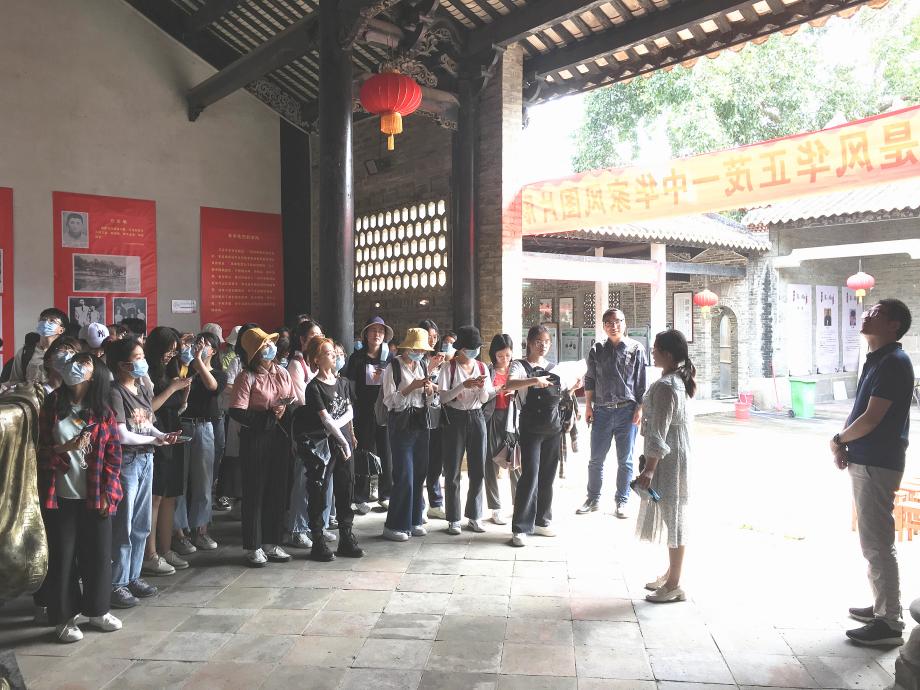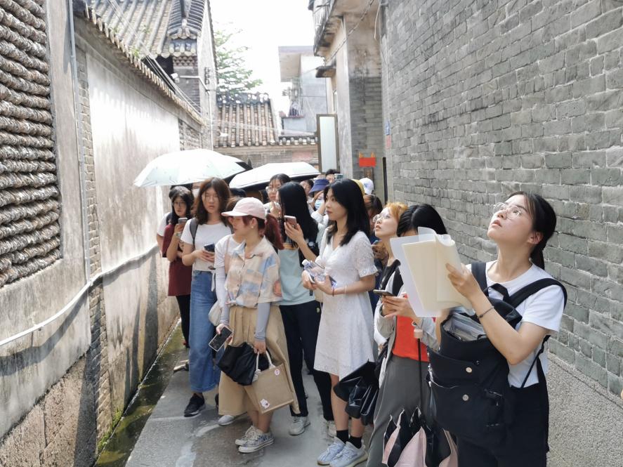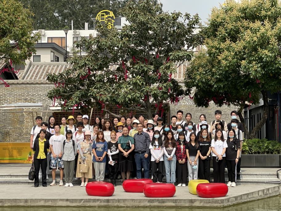 上午,师生们先后在广东恒广投资公司处联主任许晓燕和傅雨晴主管的引导下,参观了位于广州市白云区人和镇凤和村的空港文旅小镇。空港文旅小镇(凤和村改造项目)总规划面积约0.43平方公里,改造房屋550栋,农田200亩,总建筑面积约20万平方米。人和镇凤和村打造了一种“空港经济+乡村振兴”的新蓝本,是旧村保护和改造的典范。师生先后参观了由凤和村旧屋改造而成的公寓、特色民宿、非遗文化展馆、艺术画廊和直播工作室,并到凤和村的青年之家看当地介绍小镇的宣传短片。通过参观、短片、讲解和座谈,师生明了凤和旧村改造过程,同时了解传统村落向现代转变过程中,企业所作的努力。凤和村村民租赁房子给企业,企业微装修的方式对村民的房子改造然后对外运营,企业与村民协商,村落可以保留宗祠等传统要素。