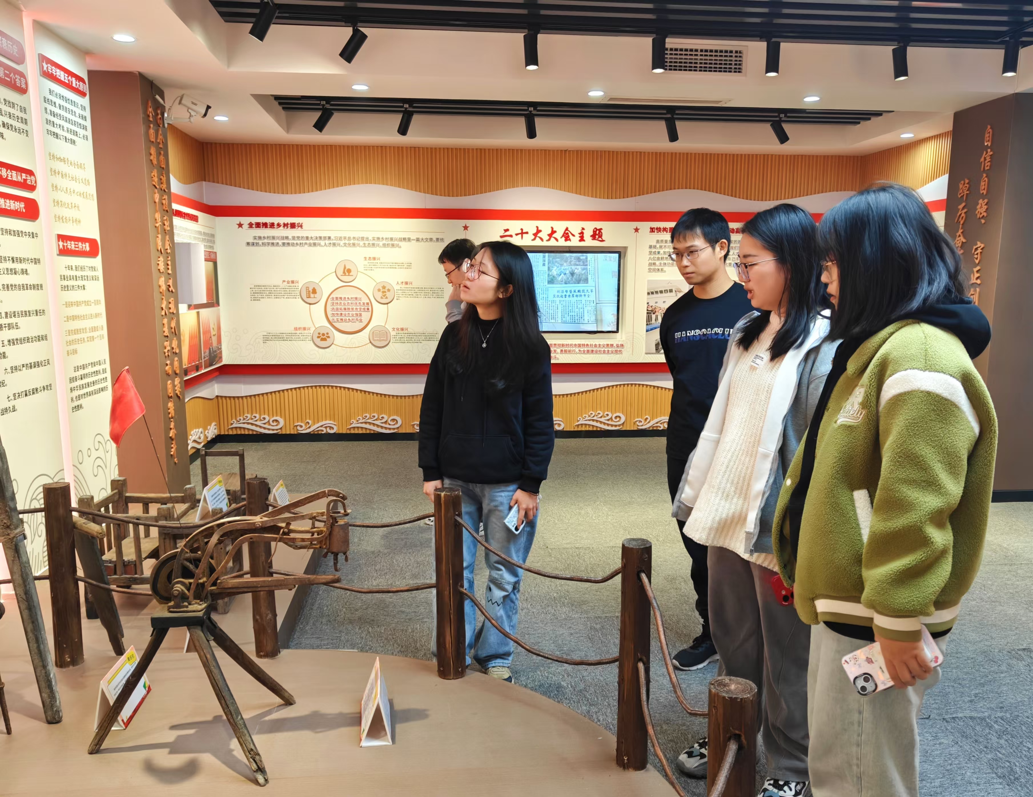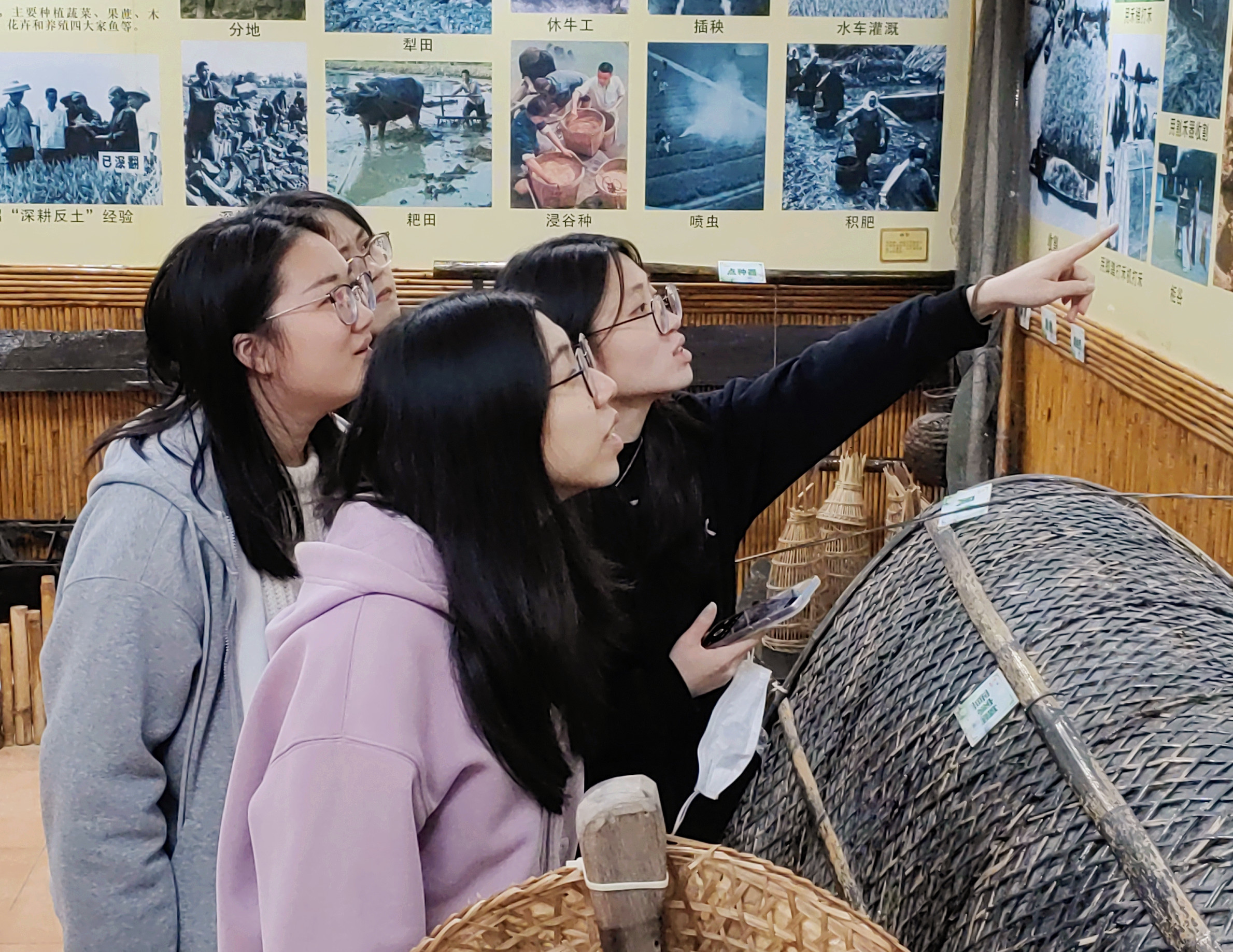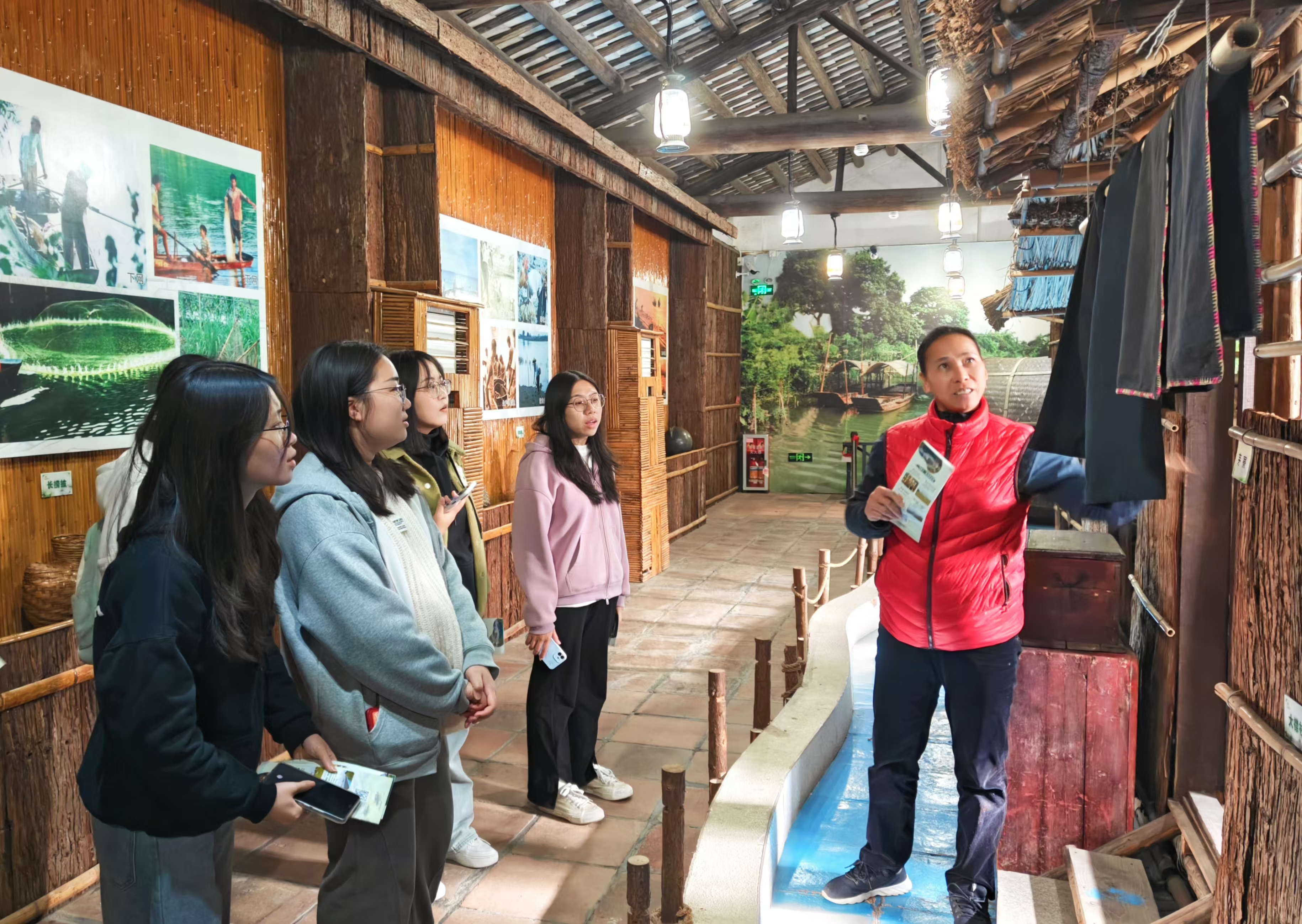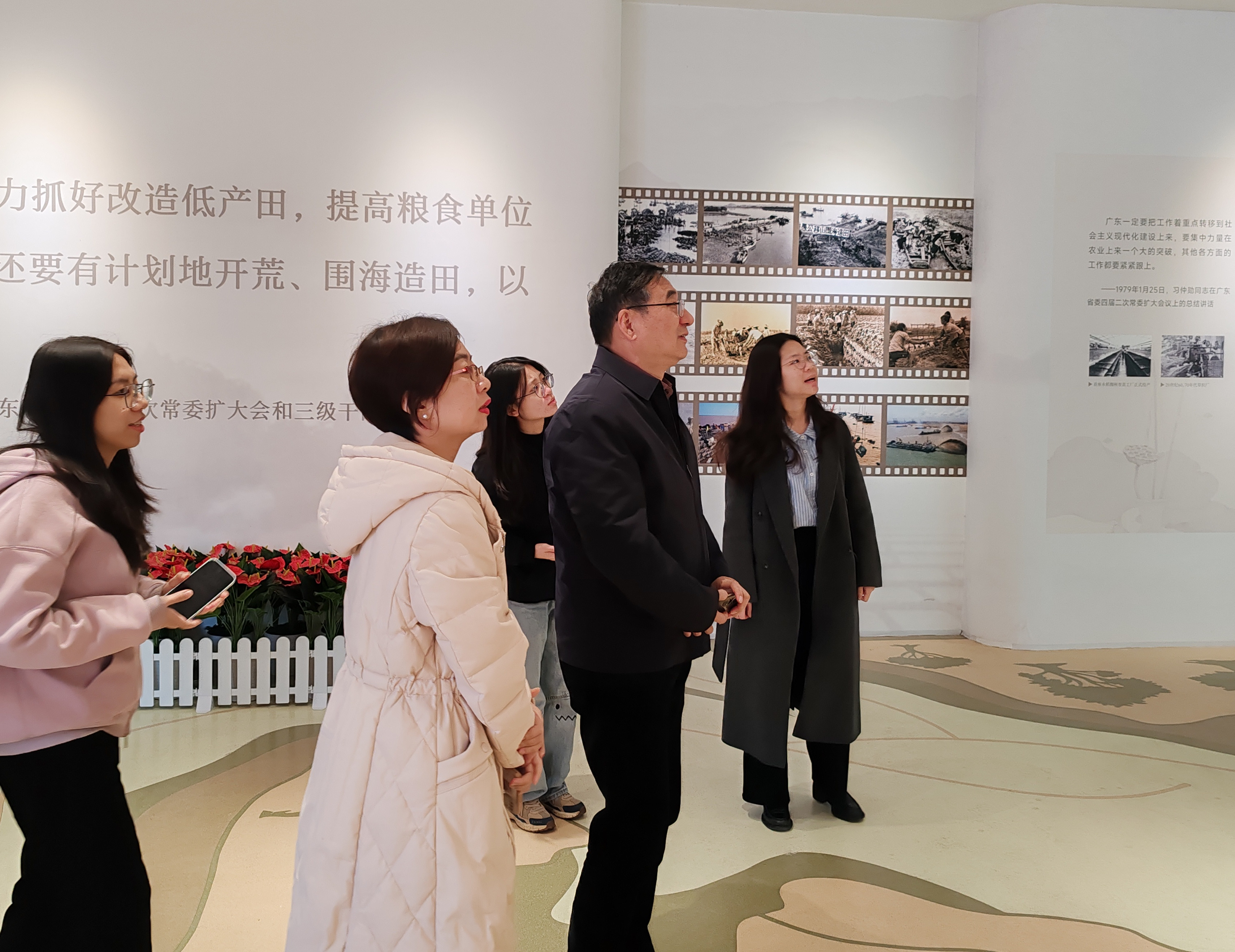 上午10时,团队到达万顷沙围垦历史陈列馆沙田水乡文化体验中心,受到南沙区农业农村局黄宇和万顷沙镇农办曾榕的迎接。万顷沙镇办曾榕带领引导团队进行参观,并向团队介绍了万顷沙围垦历史陈列馆的基本建设历程和陈列概况情况。通过浏览馆内陈列的历史照片、传统农具、文史档案资料和文字说明等丰富展品,不仅生动、全面介绍了二百年来万顷沙围垦的历史进程及辉煌成就,同时也展示万顷沙地区社会经济文化的发展,乃至整个南沙地区发展的缩影。师生们边仔细观看,拍摄相关资料,边与陪同的当地干部交流,了解重要图片、展品乃至展馆背后的故事,为数百年来团队深入了解万顷沙围垦的历史进程及辉煌成就。展馆介绍了万顷沙的发展史,这同时也是一部沙田围垦史。南沙前辈建设拓荒者不畏艰难、迎难而上,在云山珠水的岁月淤积珠江口中围出了万顷沙滩,垦出了万顷良田的奋斗历程,为后人留下了意义深远的16字“围垦历史启示”——“勤耕勇拓、锐意执行、奋袂一众和惟实励新”,彰显了南沙人在艰难困苦中的干事创业精气神和谋事成事强本领。