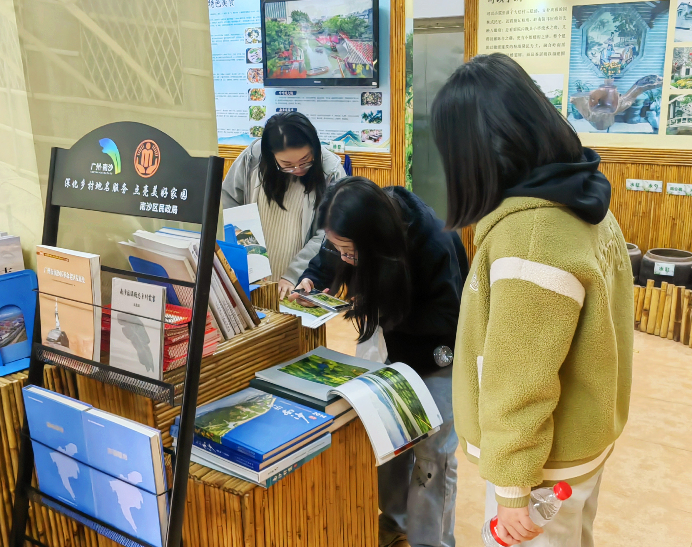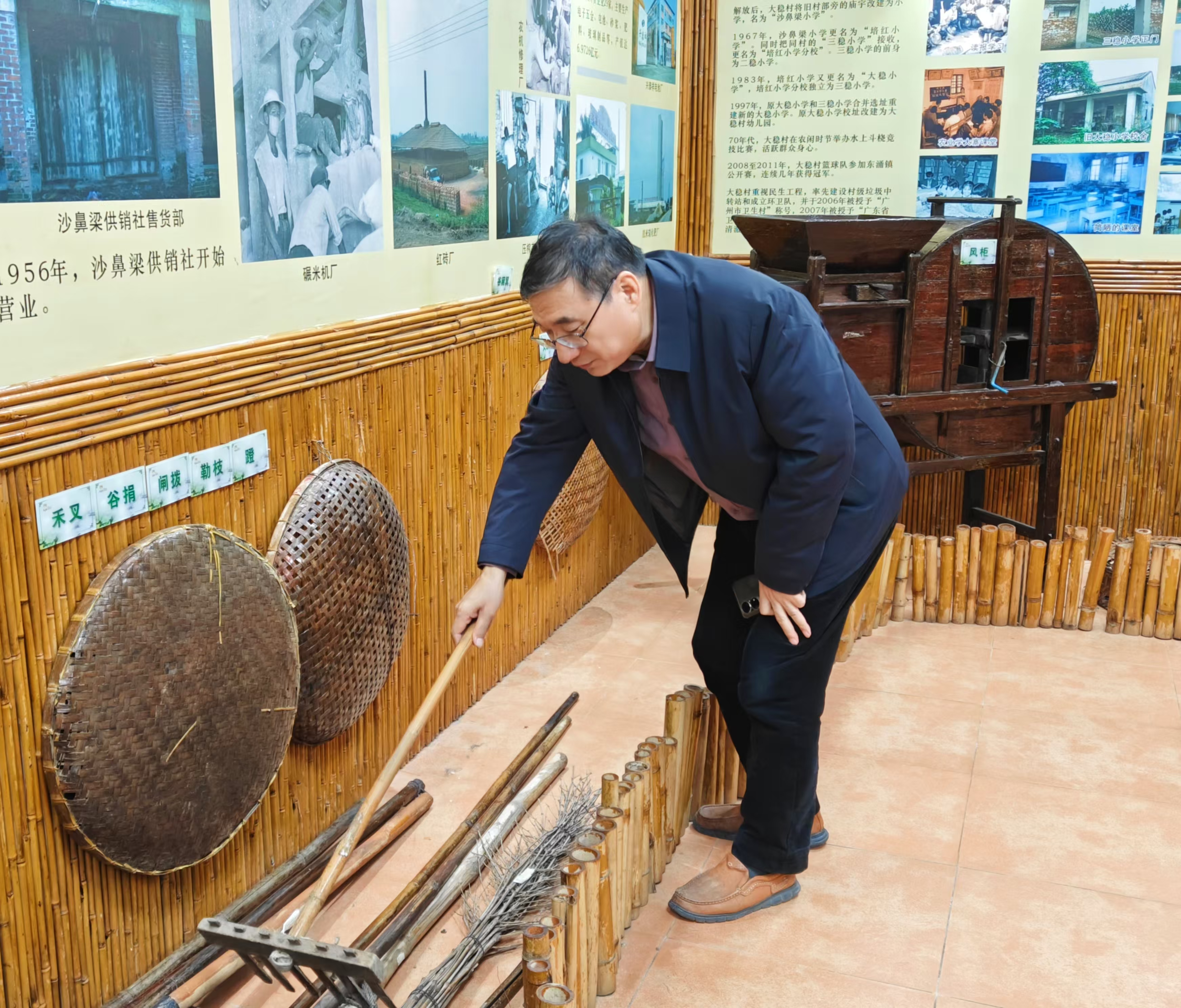 下午4时,团队到达大稳村展览馆。展览馆从农业生产、居住房屋、特色美食、文教体卫等多方面展现大稳村的发展变迁,生动体现了当地水乡文化、疍家文化的独特魅力。同时,展馆内展出了数量众多、保存情况良好的农具,倪教授与团队成员就部分农具的使用方法展开讨论。大稳村展览馆内陈列的当地志书也吸引了团队成员的关注,团队通过翻阅这些方志图册,对大稳村及东涌镇的有关情况有了进一步的了解。
